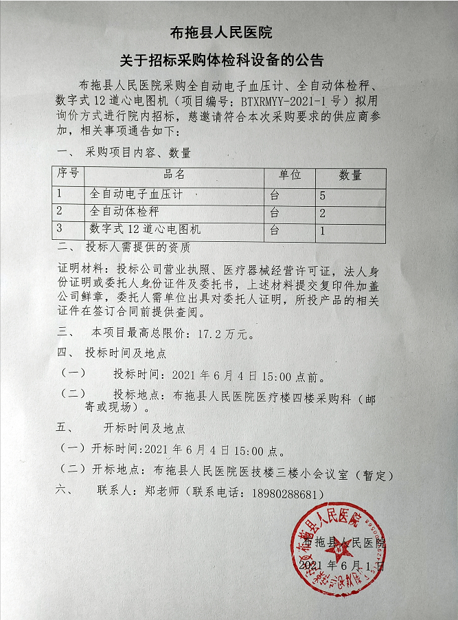 布拖县人民医院体检科设备采购公告